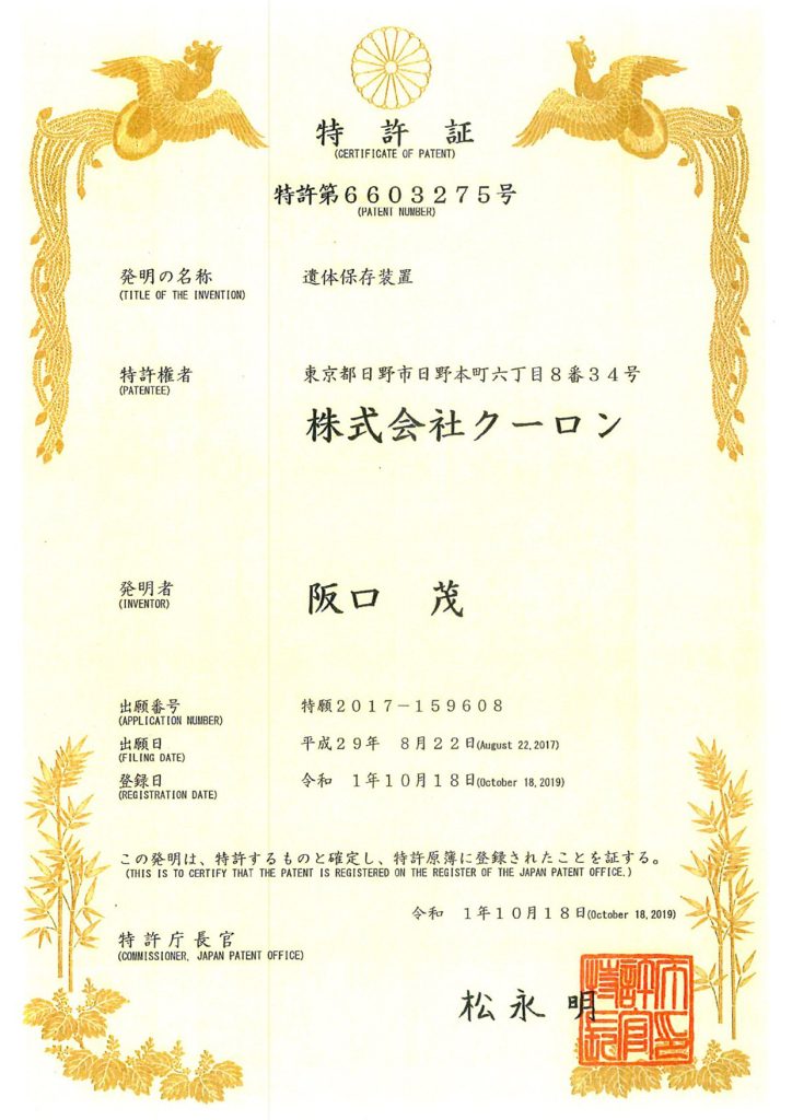 独自開発による電場方式によりドライアイスを一切使用しないまったく新しいご遺体保存技術で特許を取得しました