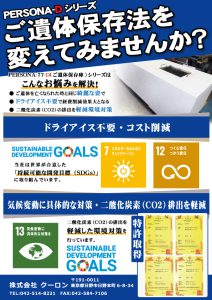 ご遺体長期保存は世界初!特許取得のご遺体保存用冷蔵庫「ペルソナ」が解決!ドライアイス不要!ご遺体を綺麗なお姿で。ご遺体保存、火葬待ちのご遺体保管にお困りの葬儀社様、寺院様、病院様、まずはお気軽にご相談ください。